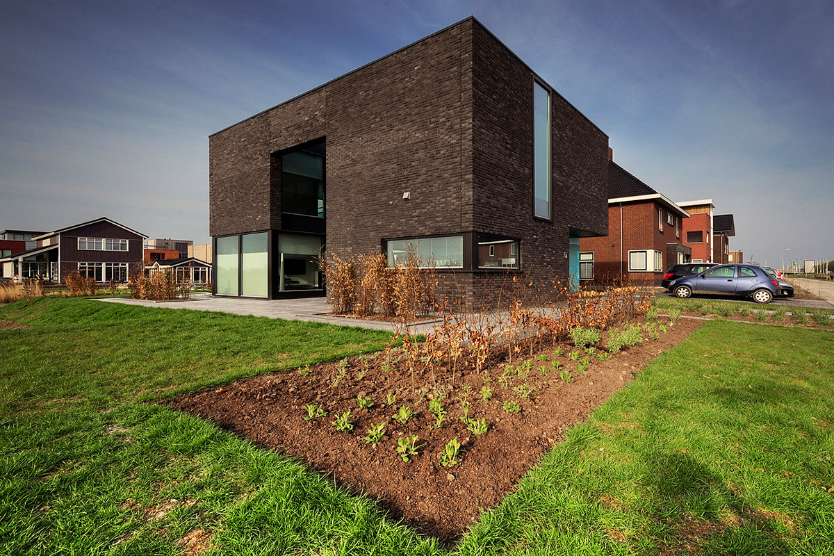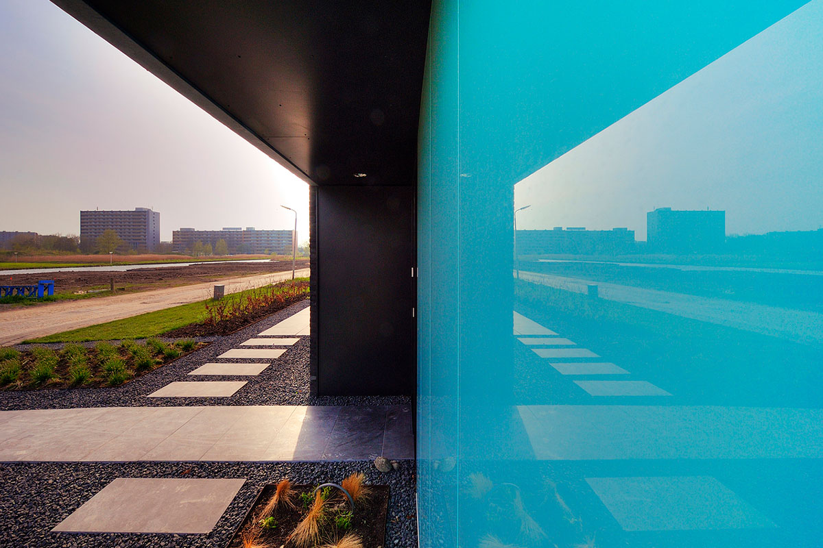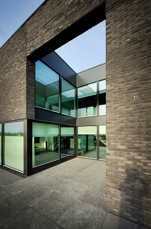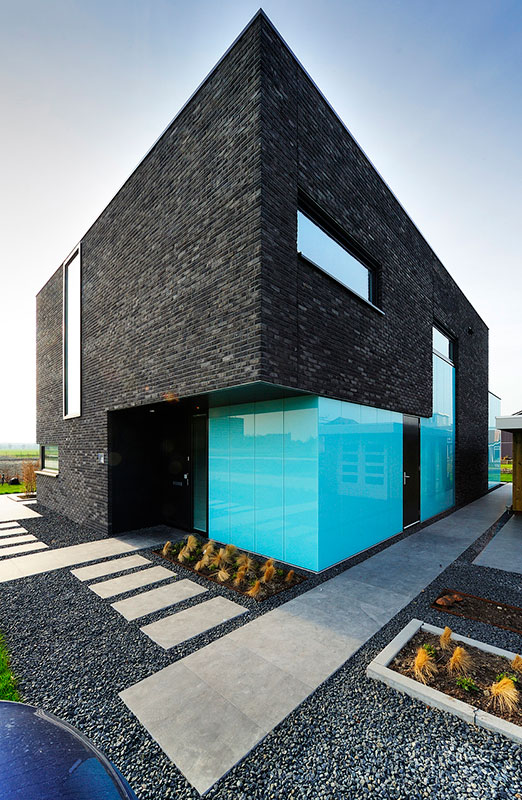 De twee volumes zijn uitgevoerd in contrasterende gevelmaterialen; een volume van donkere baksteen die gedragen wordt door een gekleurd lichtgroen glazen volume.