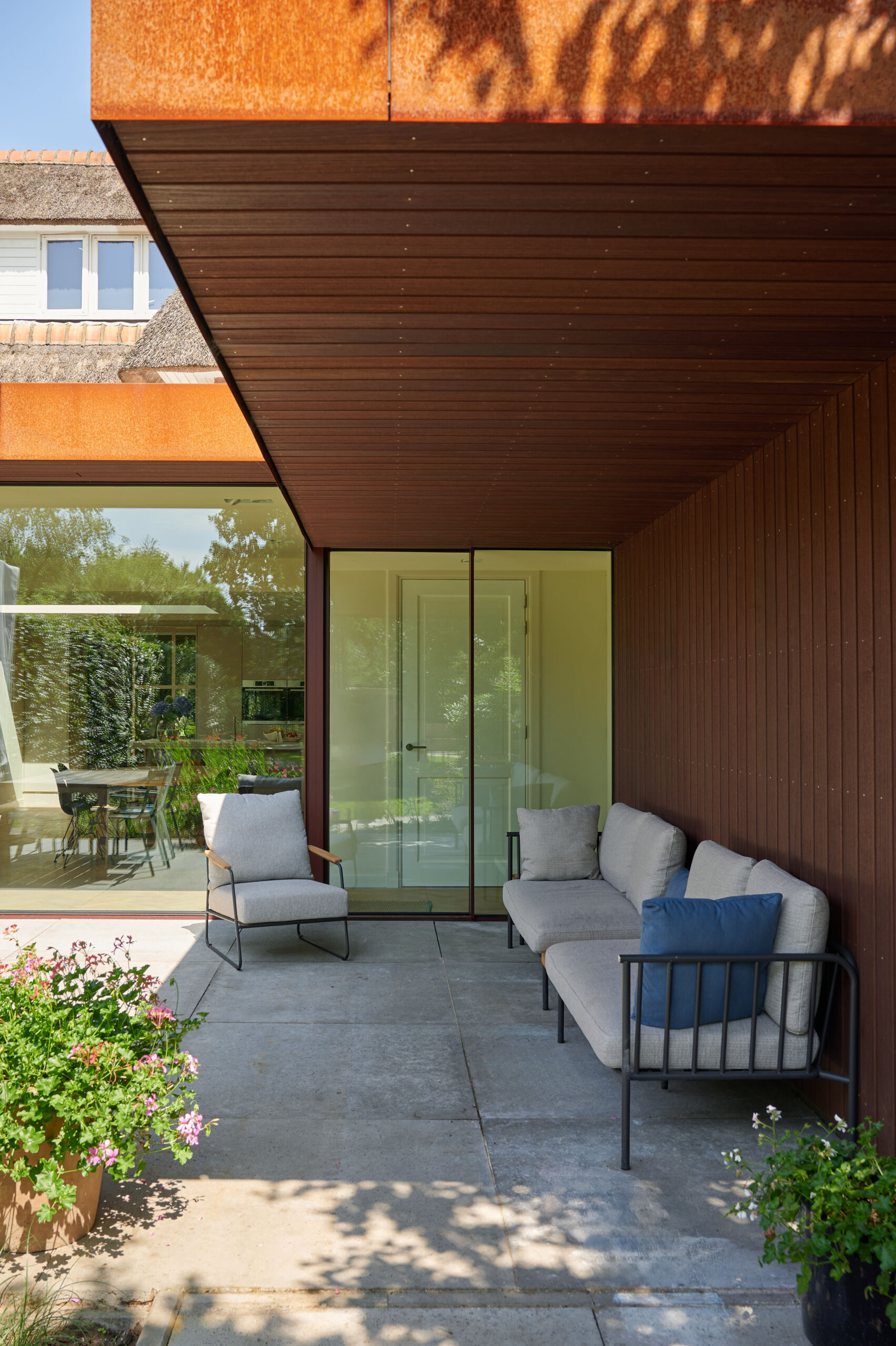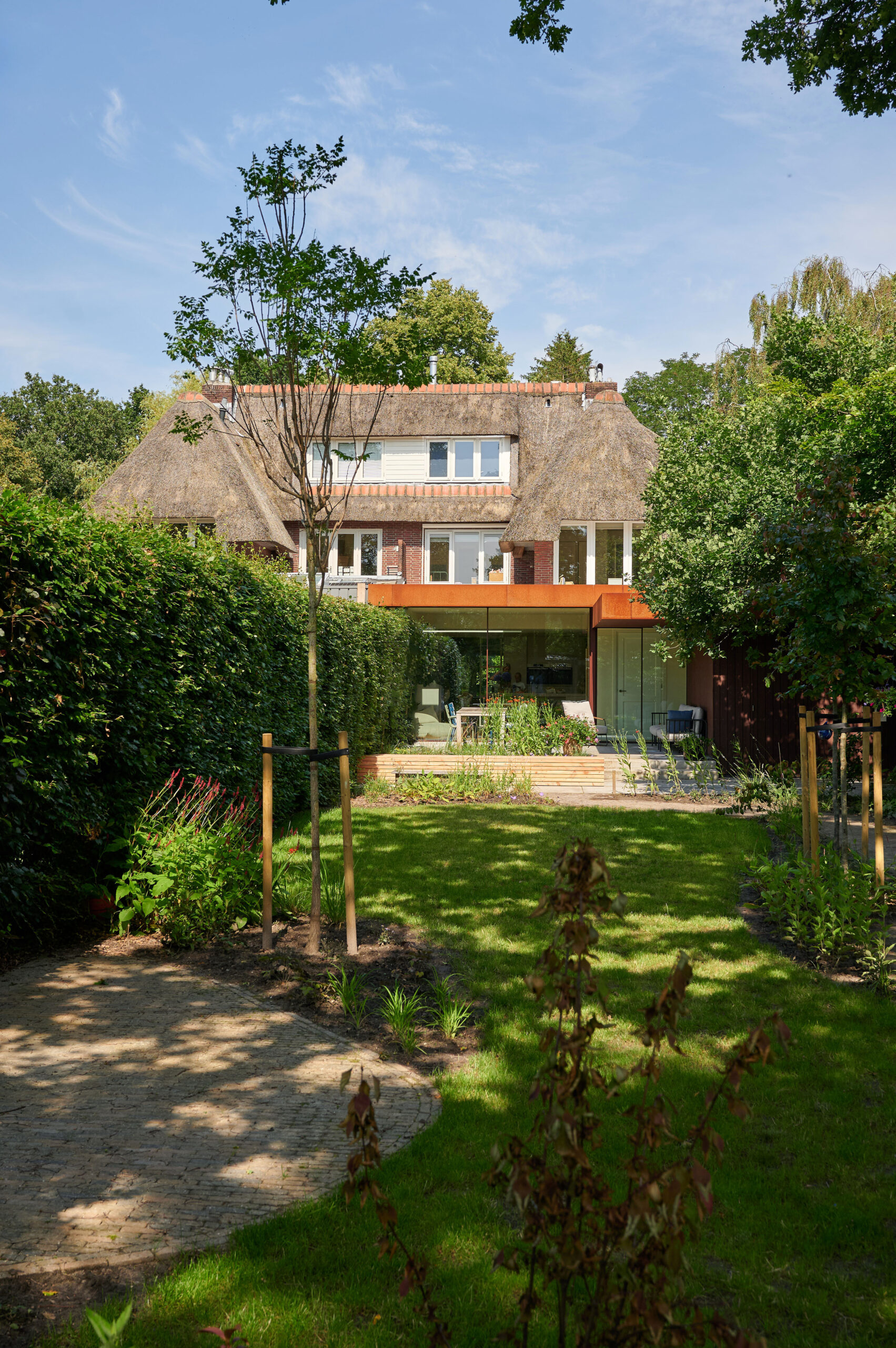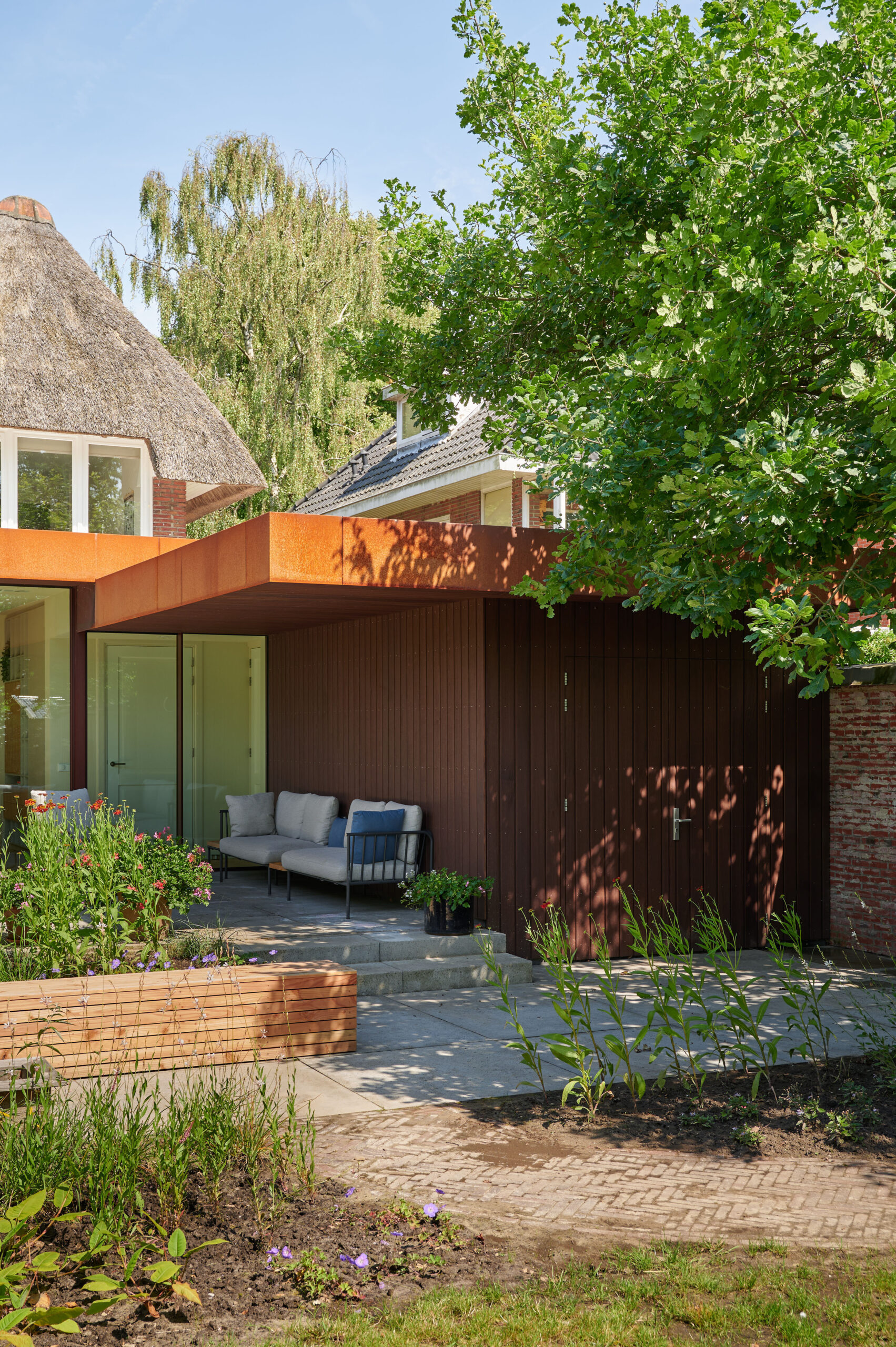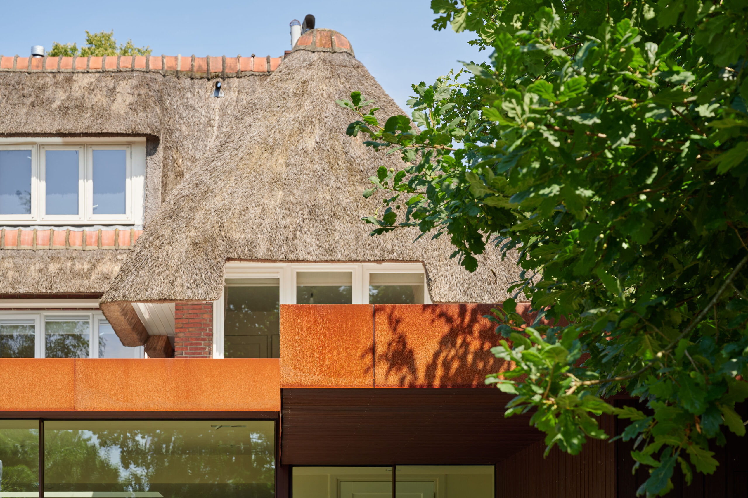 De uitbouw is een moderne toevoeging aan de woning. De grote glasvlakken vormen een scherp contrast met het bakstenen huis. De materialisatie van de dakrand, het plafond en de gesloten gevels van de uitbreiding zoeken in dit contrast juist weer de aansluiting met de bestaande situatie. Het cortenstaal en de houten latten geven het ontwerp een warme sfeer die past bij de bruinrode gevelstenen en de rieten kap. De haarfijne uitwerking van de minimalistische details heeft het voorgenomen ambitieniveau waargemaakt.