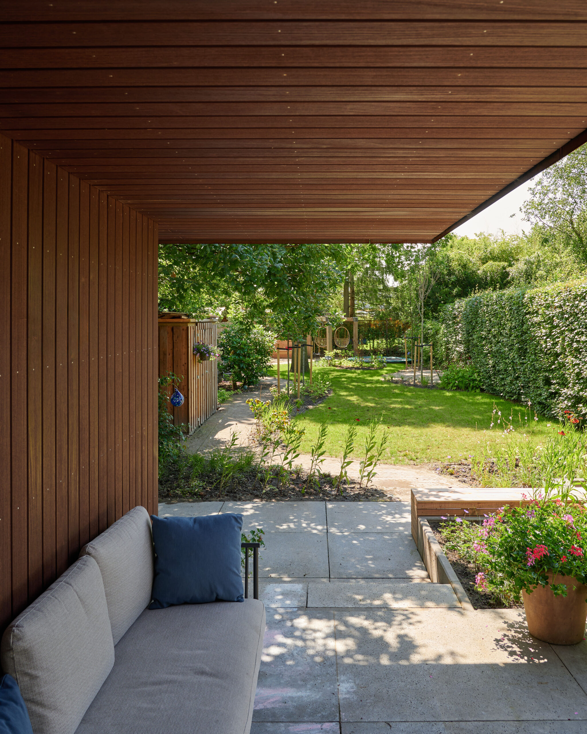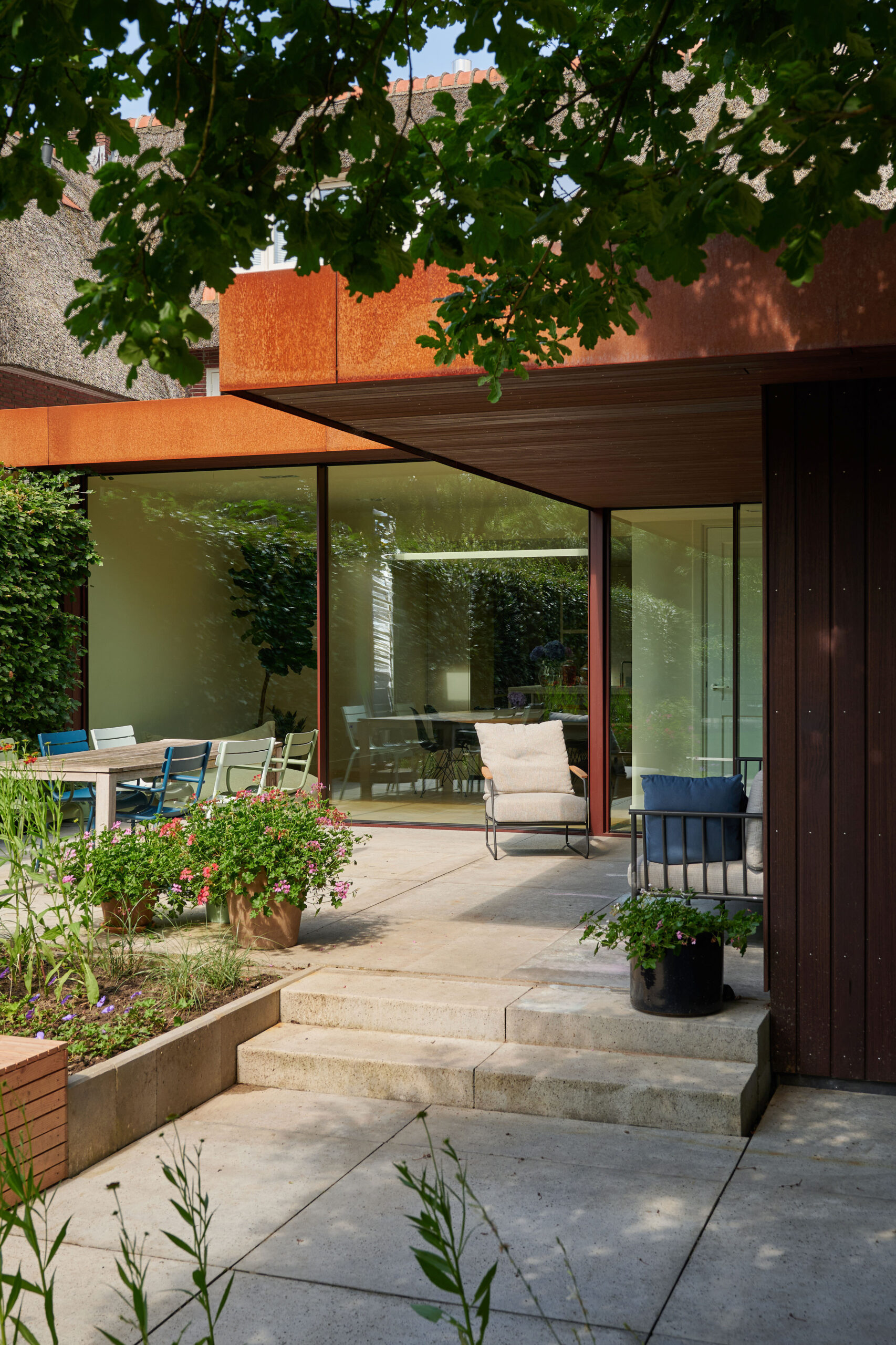 De hoogste schijf sluit aan op de uitbouw van de buren en de plafondhoogte in de woonkeuken. Onder het overstek bevindt zich een fraaie, minimalistische schuifpui waardoor er een directe relatie met de tuin wordt gelegd.