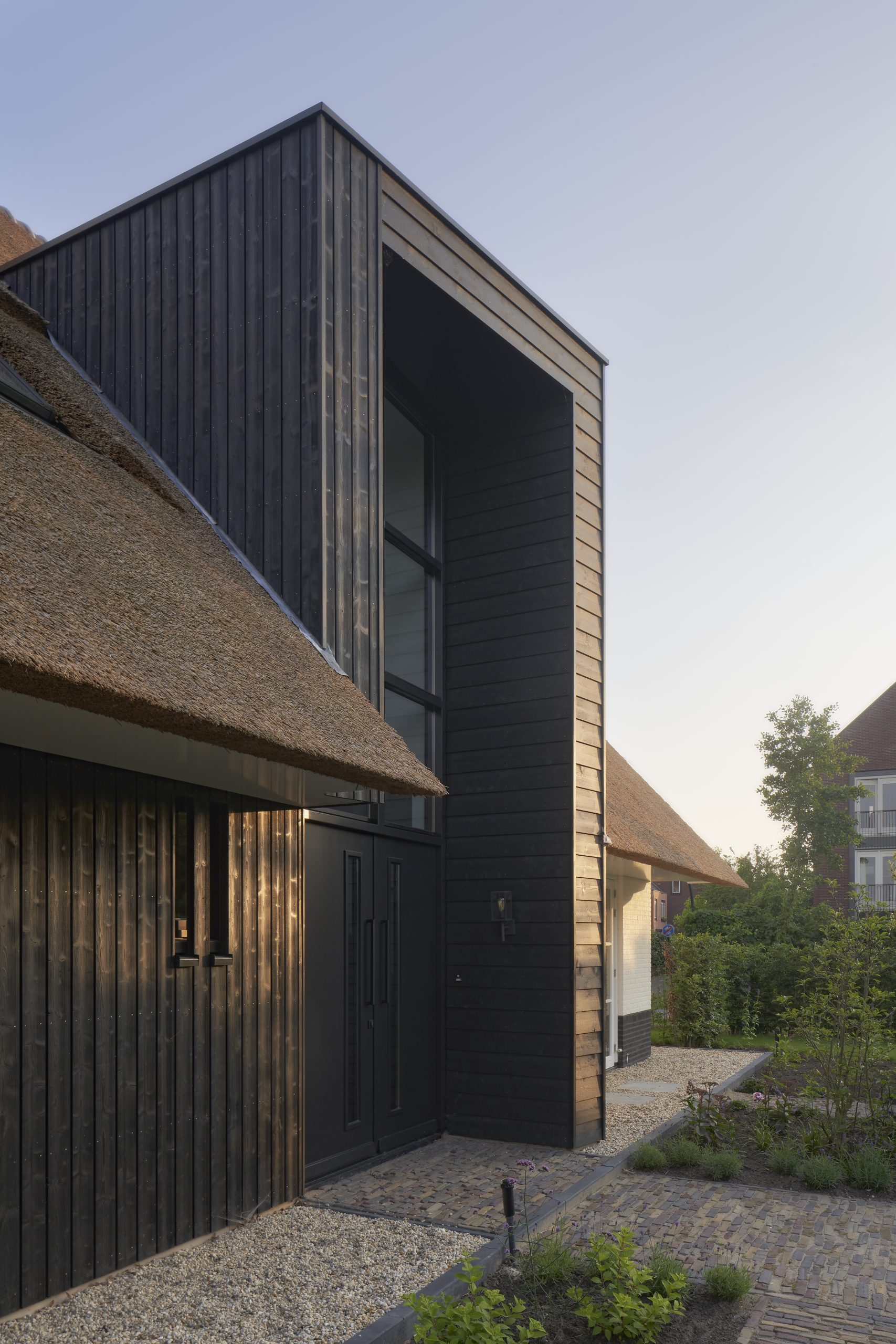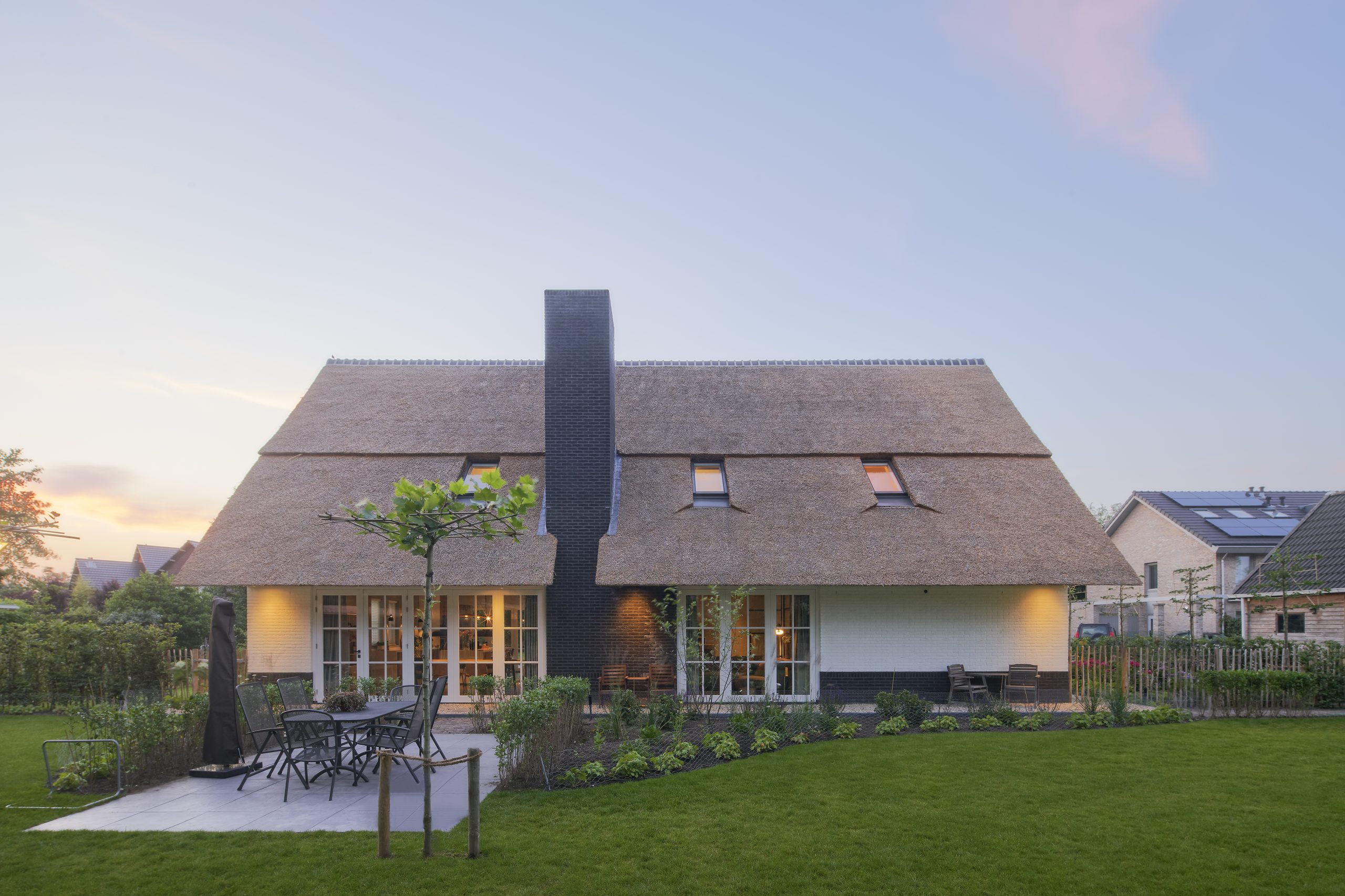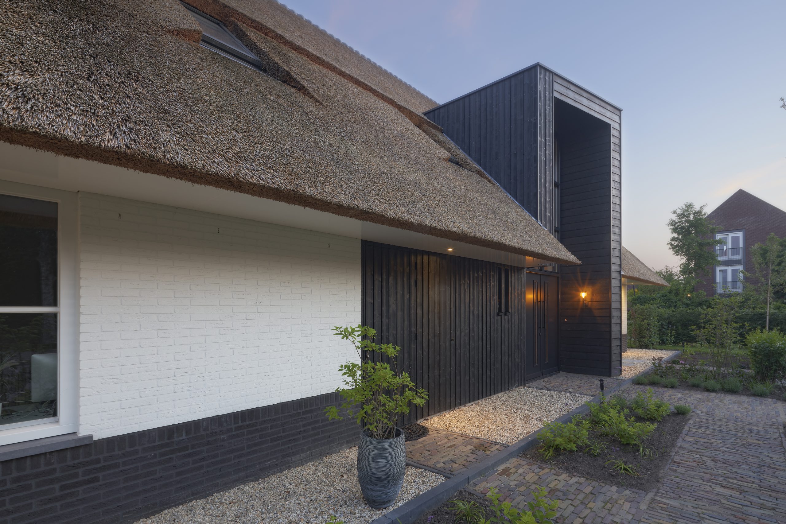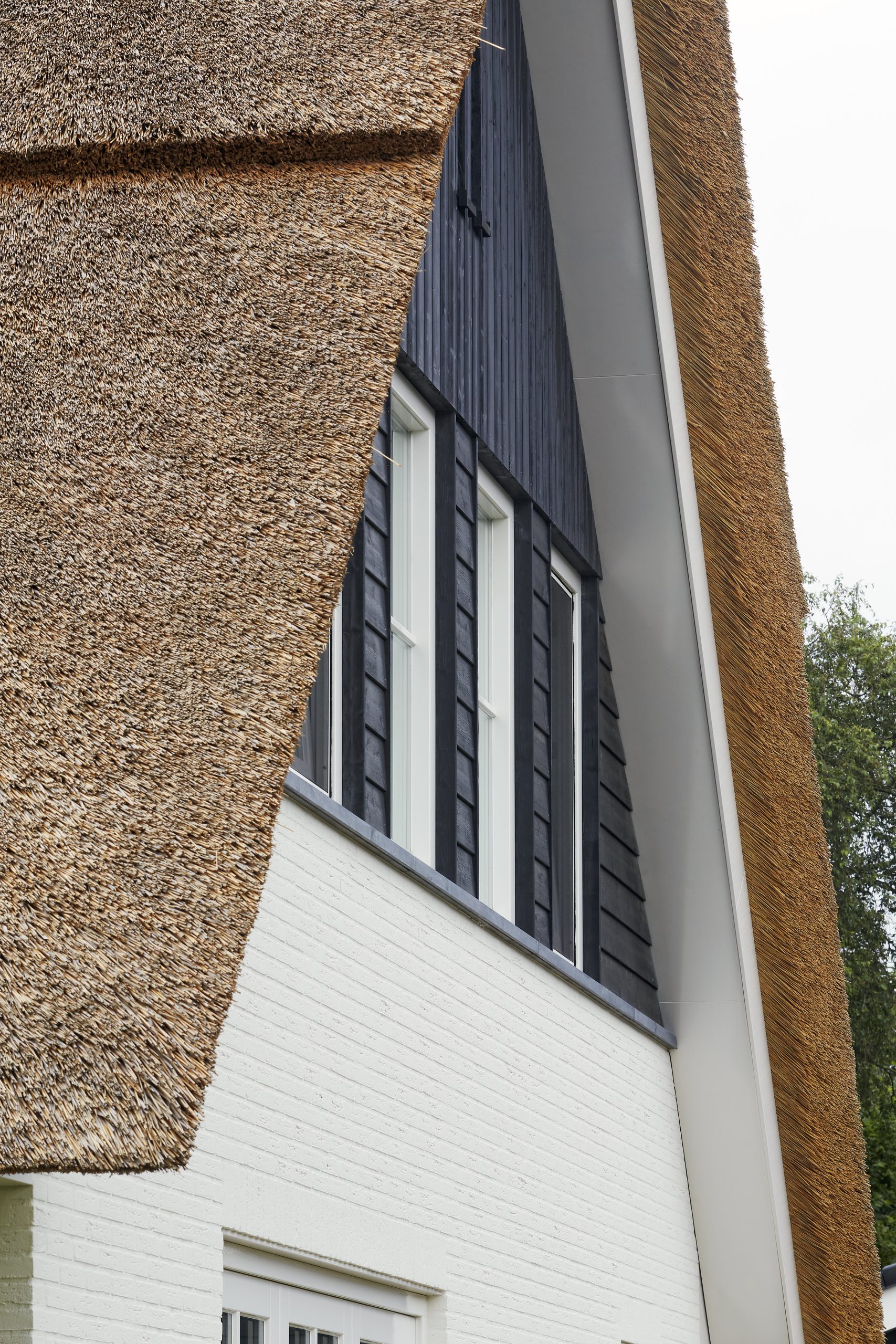 Het ontwerp combineert rust en dynamiek. Onder de rieten kappen komen moderne architectonische elementen samen in een helder geheel. Grote raampartijen zorgen voor transparantie en daglicht, terwijl zwarte houten accenten een krachtig contrast vormen met de witte gevel en het donkere trasraam.