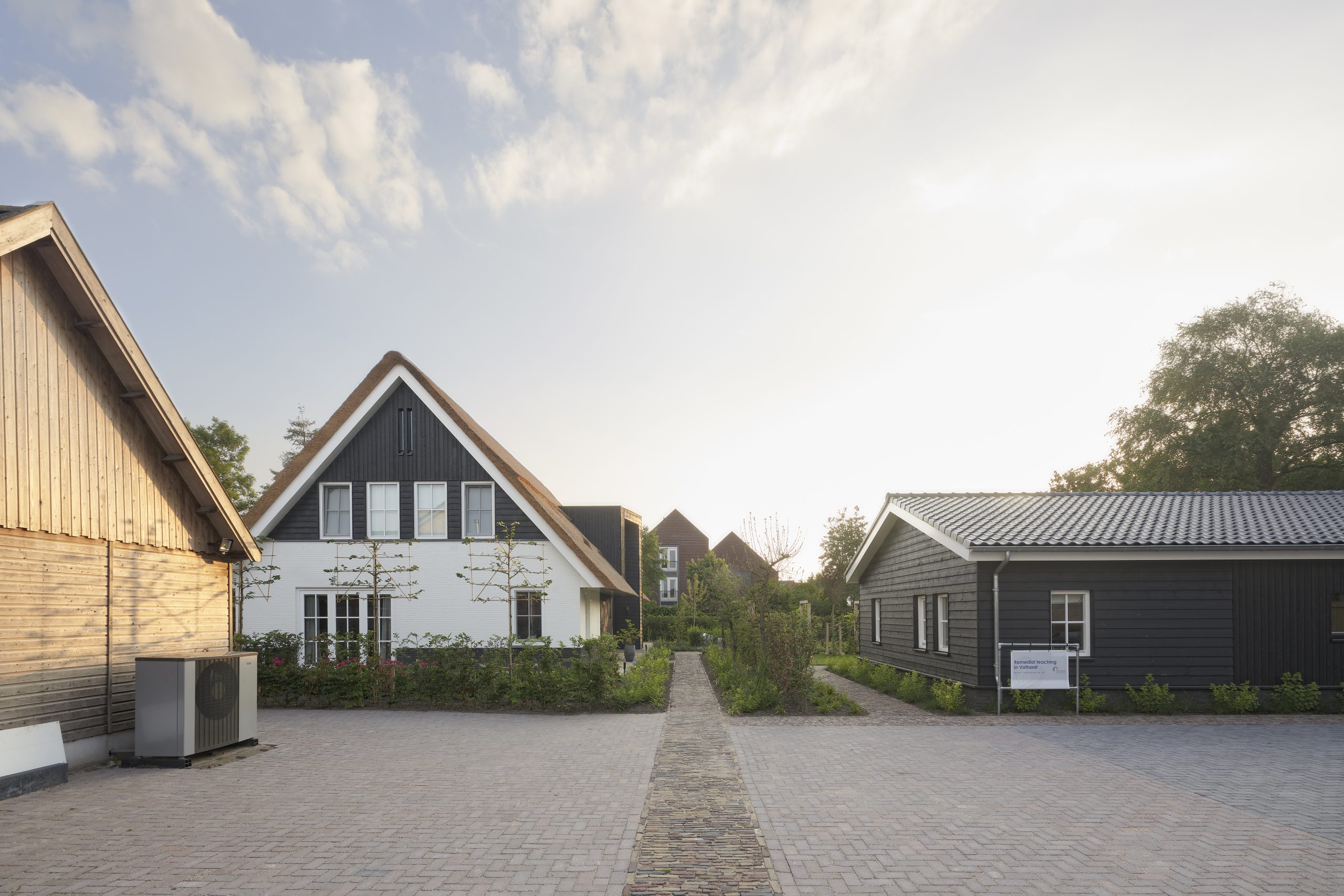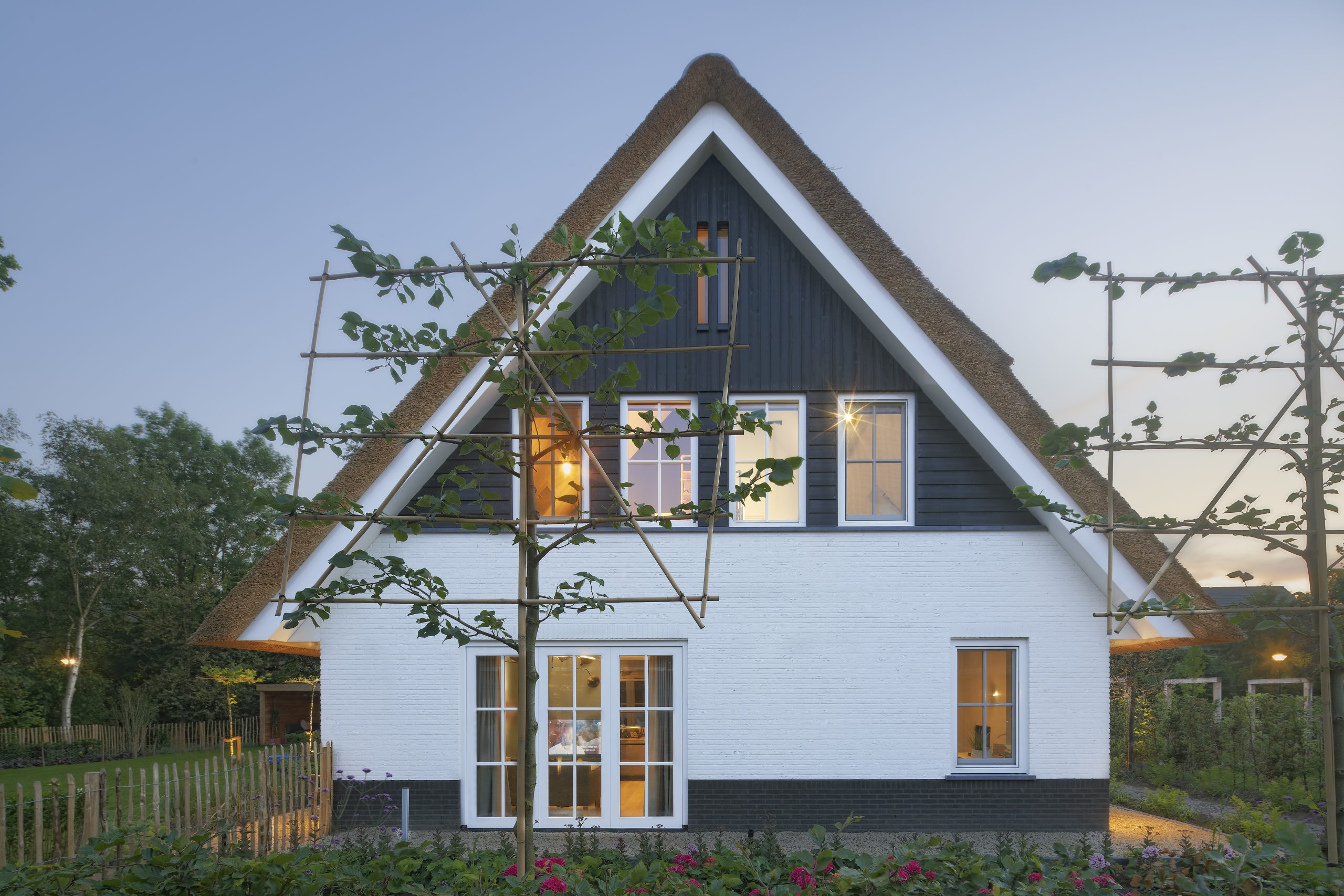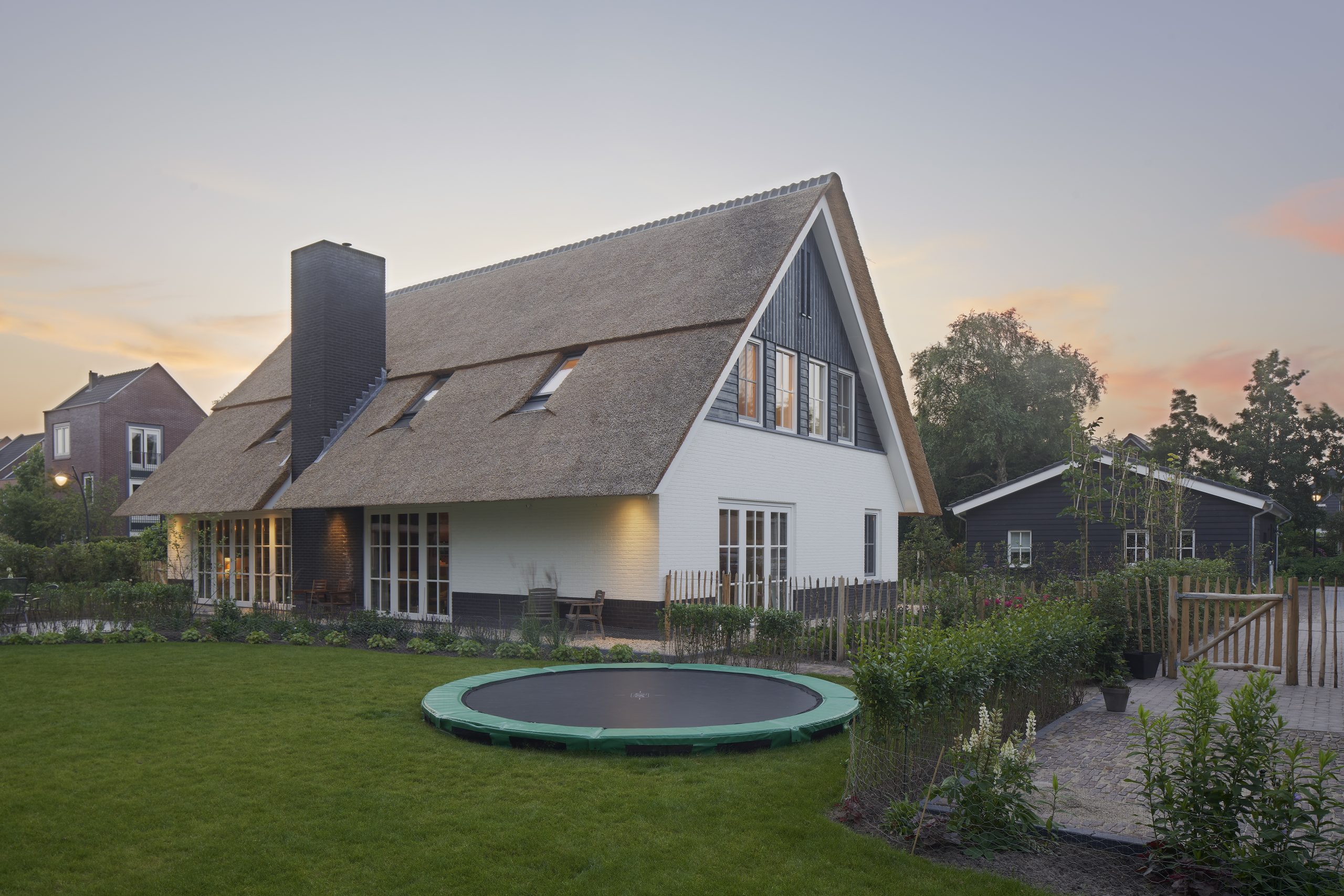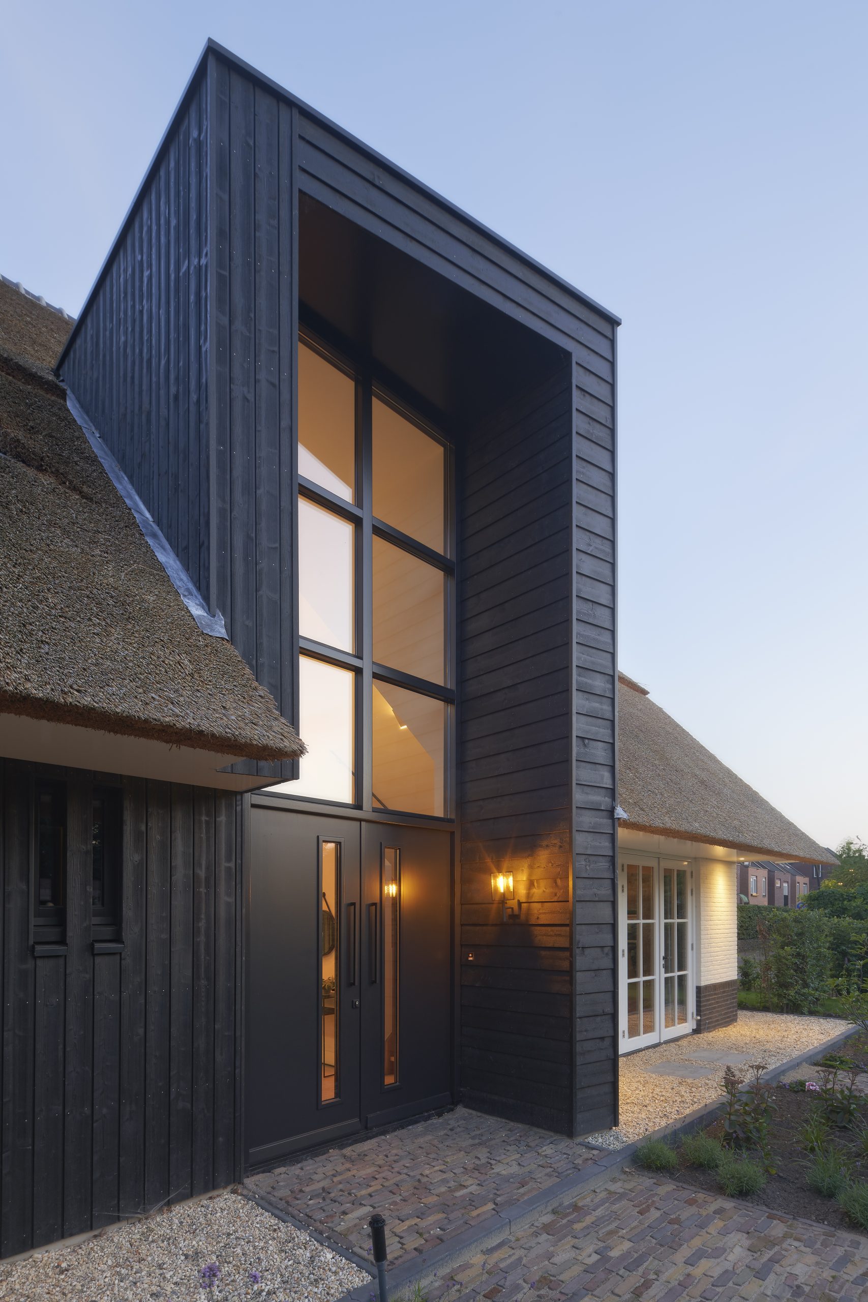 Het ontwerp combineert rust en dynamiek. Onder de rieten kappen komen moderne architectonische elementen samen in een helder geheel. Grote raampartijen zorgen voor transparantie en daglicht, terwijl zwarte houten accenten een krachtig contrast vormen met de witte gevel en het donkere trasraam.
